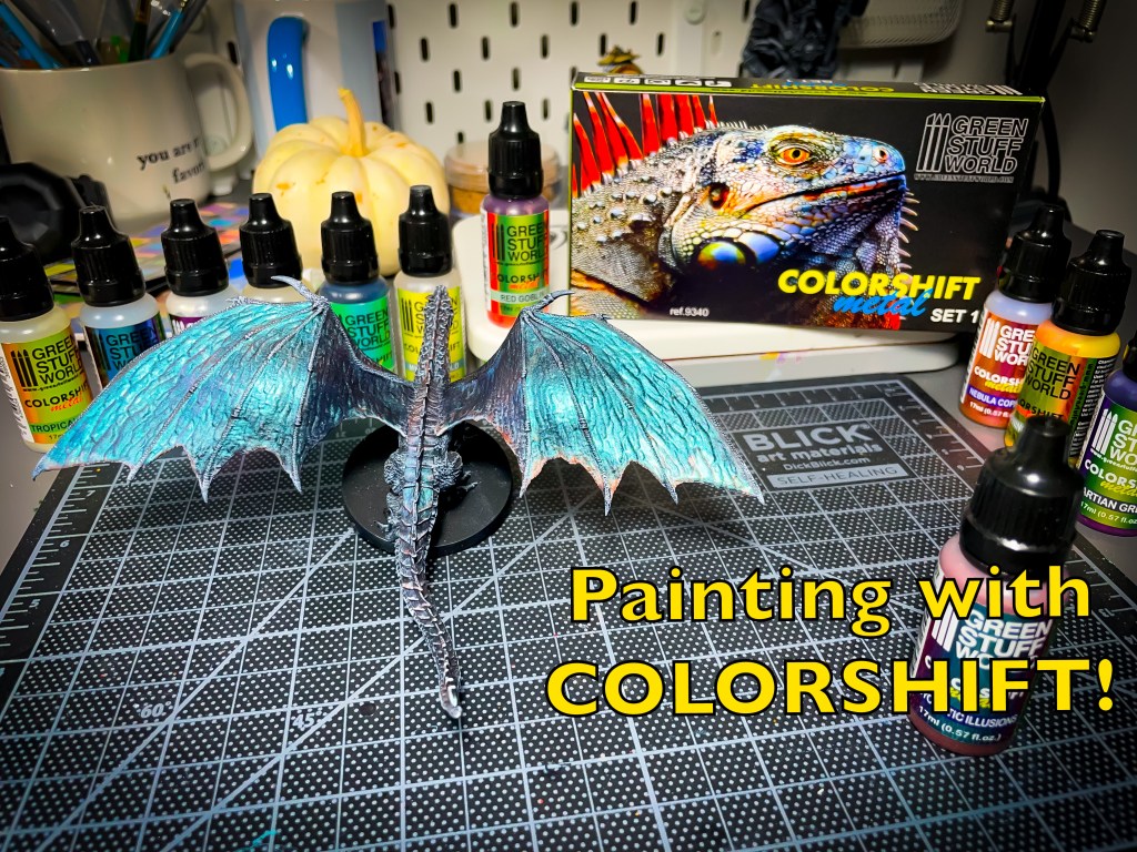 I absolutely love this brand of paint. They easily apply directly onto the model and give an iridescent effect. I primed my figures in black before using the Colorshift paints.